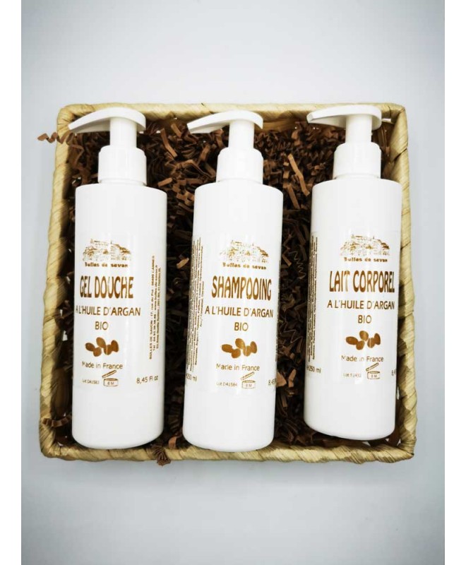 Gel douche à l’Huile d'Argan 250ml : Aqua, Sodium Laureth Sulfate, Sodium Chloride, Peg-4 Rapeseedamide, Glycerine, Citric Acid, Propylene Glycol, Benzyl Alcohol, Magnesium Nitrate, Octadecyl Di-T-Butyl -4hydroxyhydrocinnamate, Magnesium Chloride, Methylchloroisothiazolinone, Methylisothiazolinone, Glycerin, Argania Spinosa, Parfum, Linalool, Hydroxycitronnellal, Amyl Cinnamal, Geraniol
