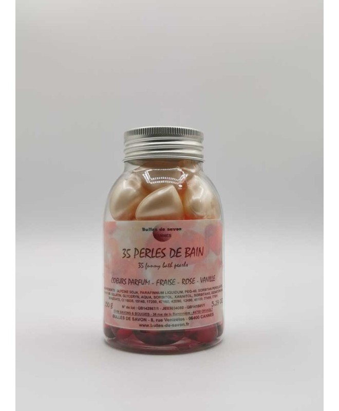 Perles de bain colorées en forme de cœur et composées d’huile parfumée.